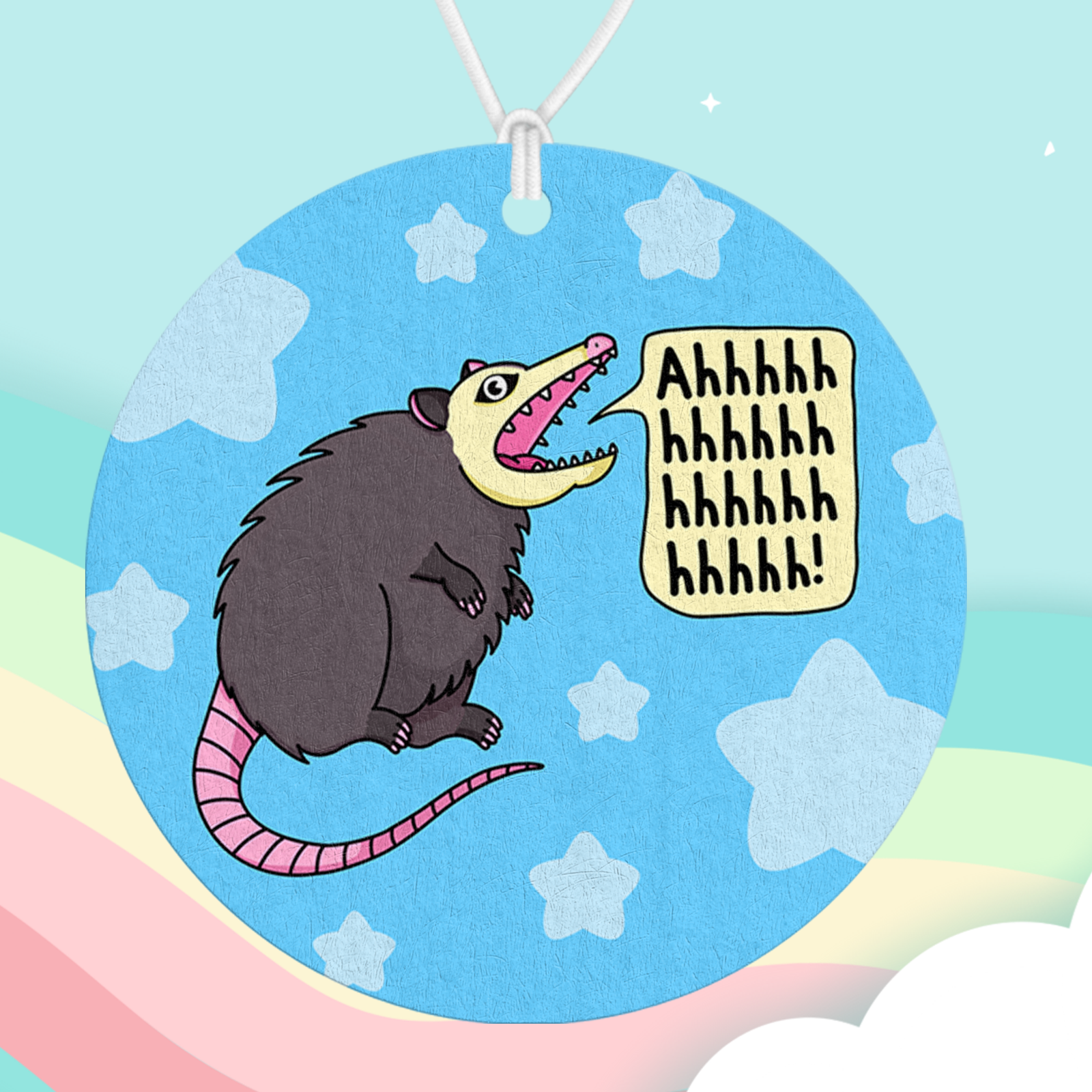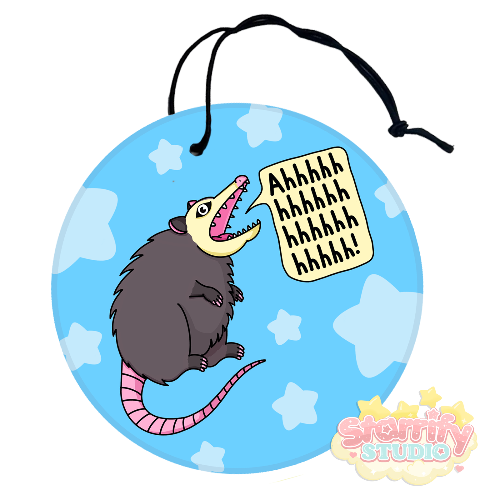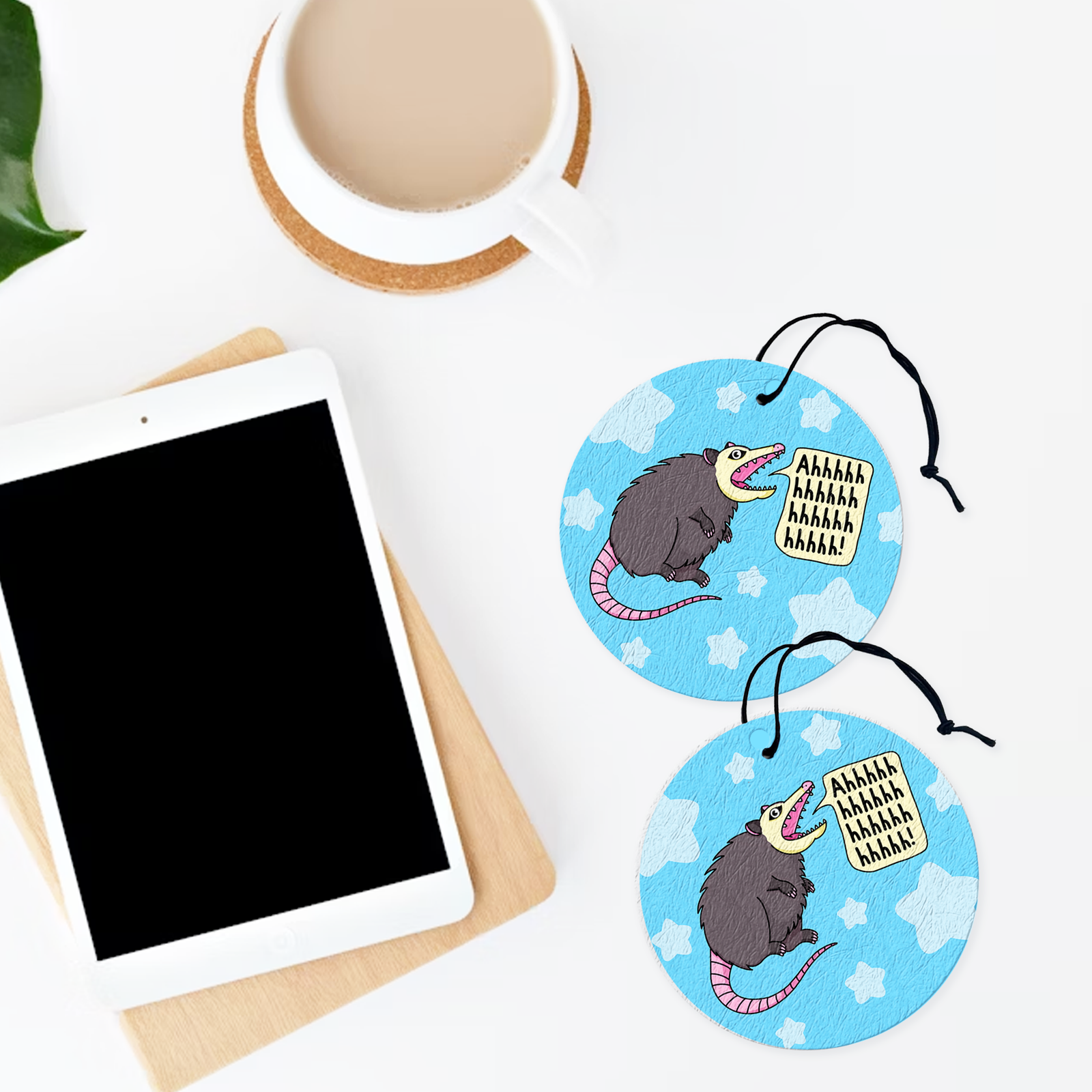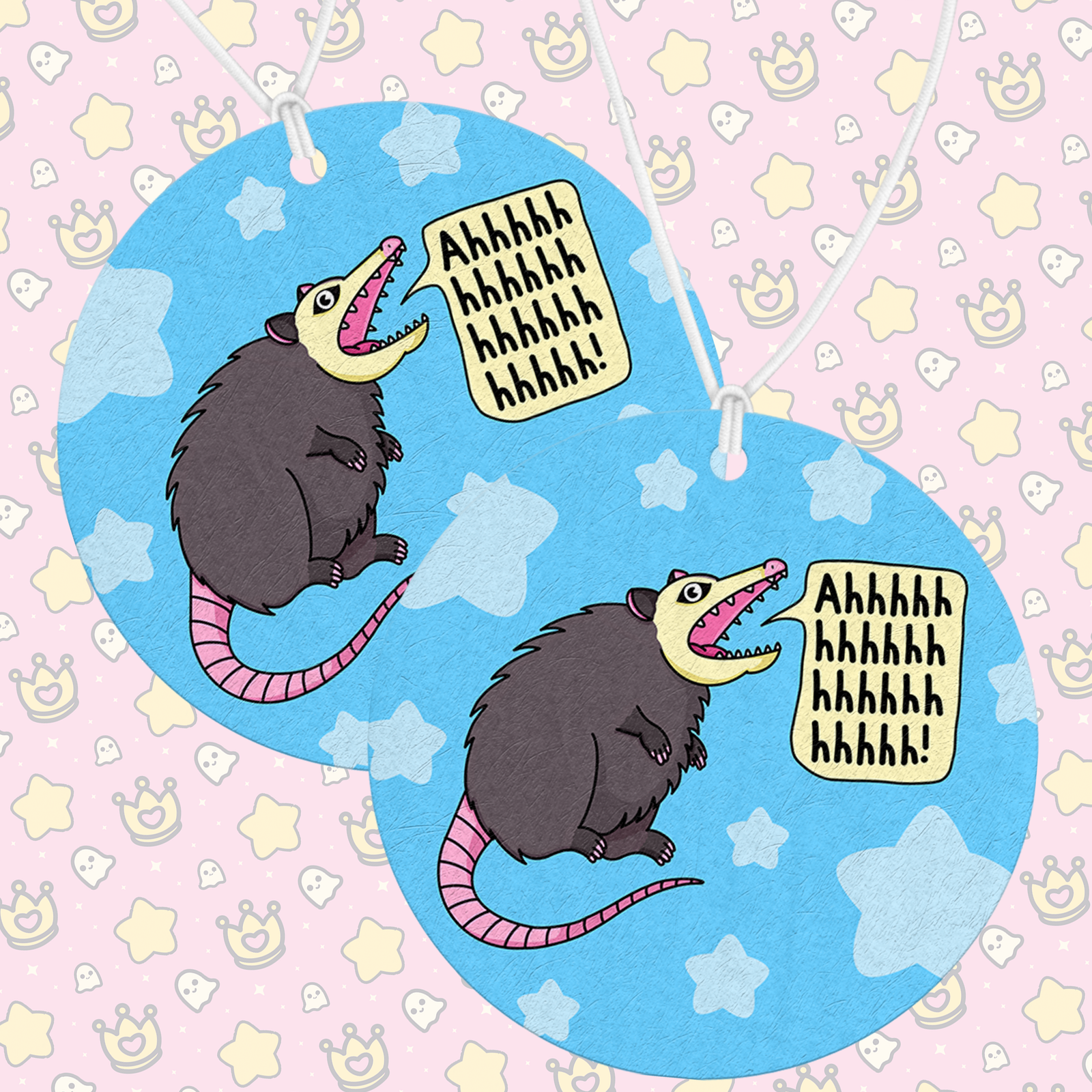 A chaotic and playful air freshener featuring our Ahh Anxiety Possum design. Add your favorite scent and bring a little humor and relatable energy to your space.