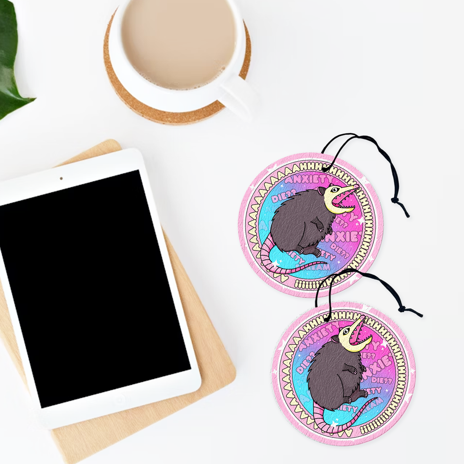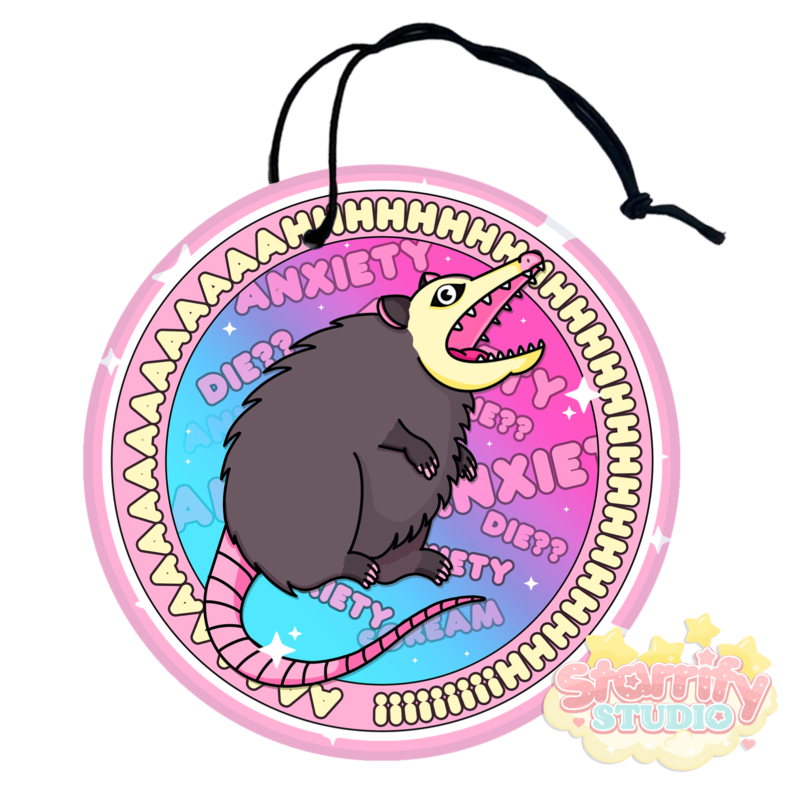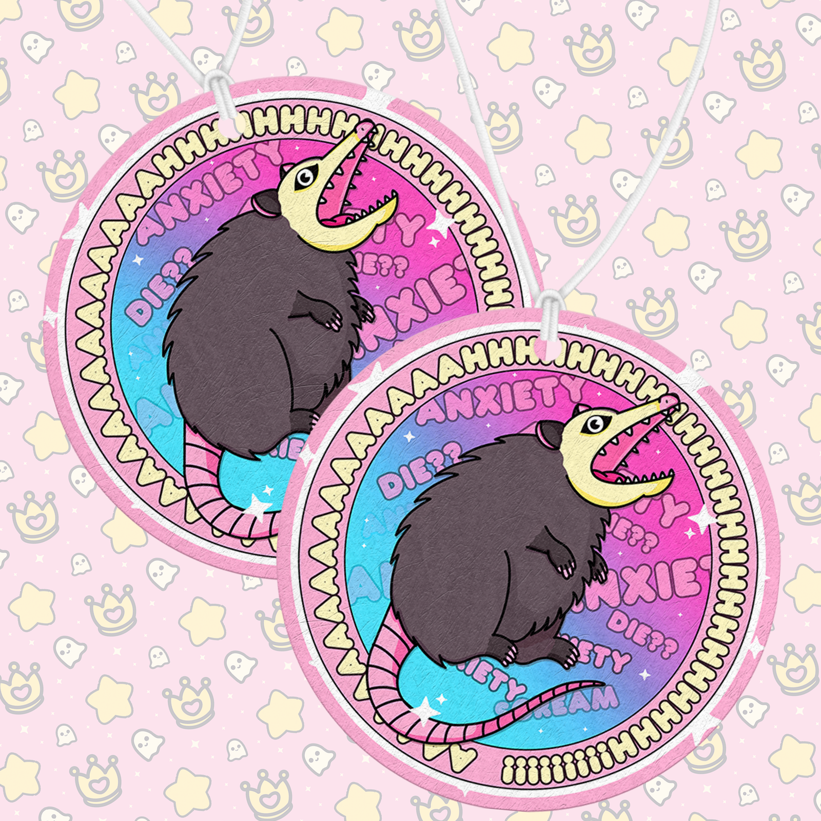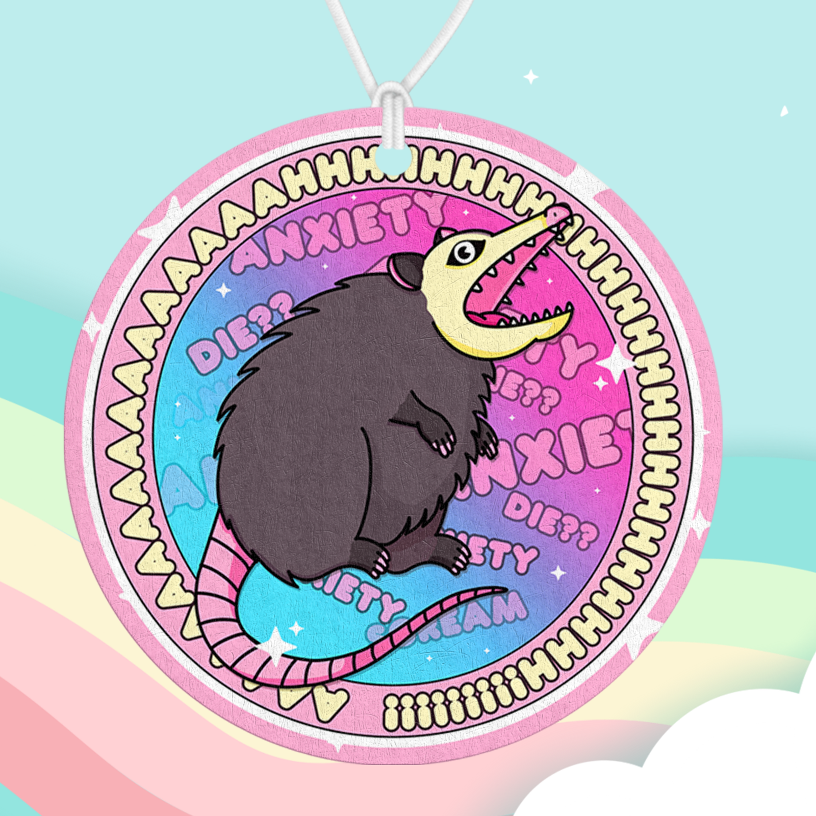 A chaotic and expressive air freshener featuring our viral Anxiety Possum design. Add your favorite scent and bring a little relatable energy and comfort to your space.