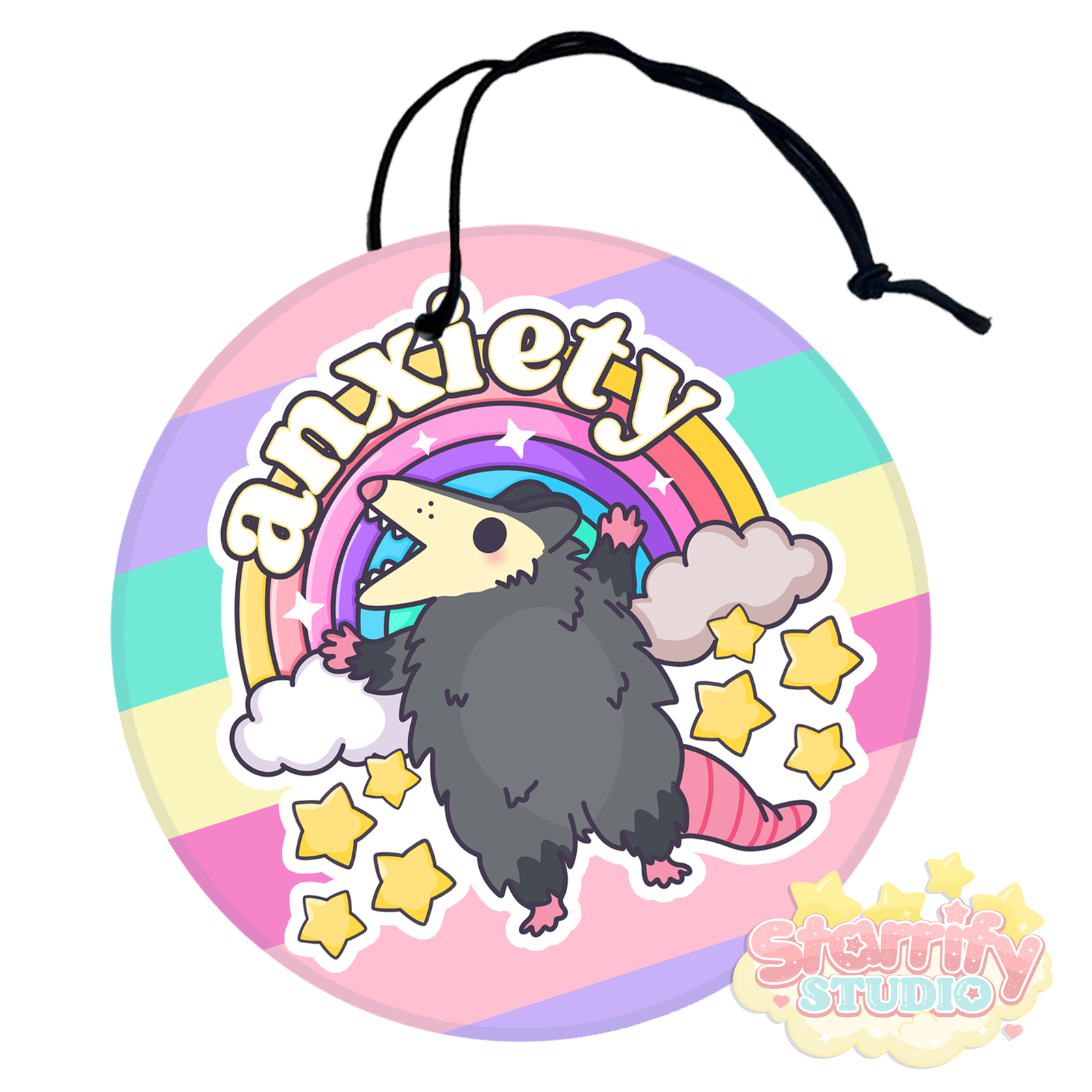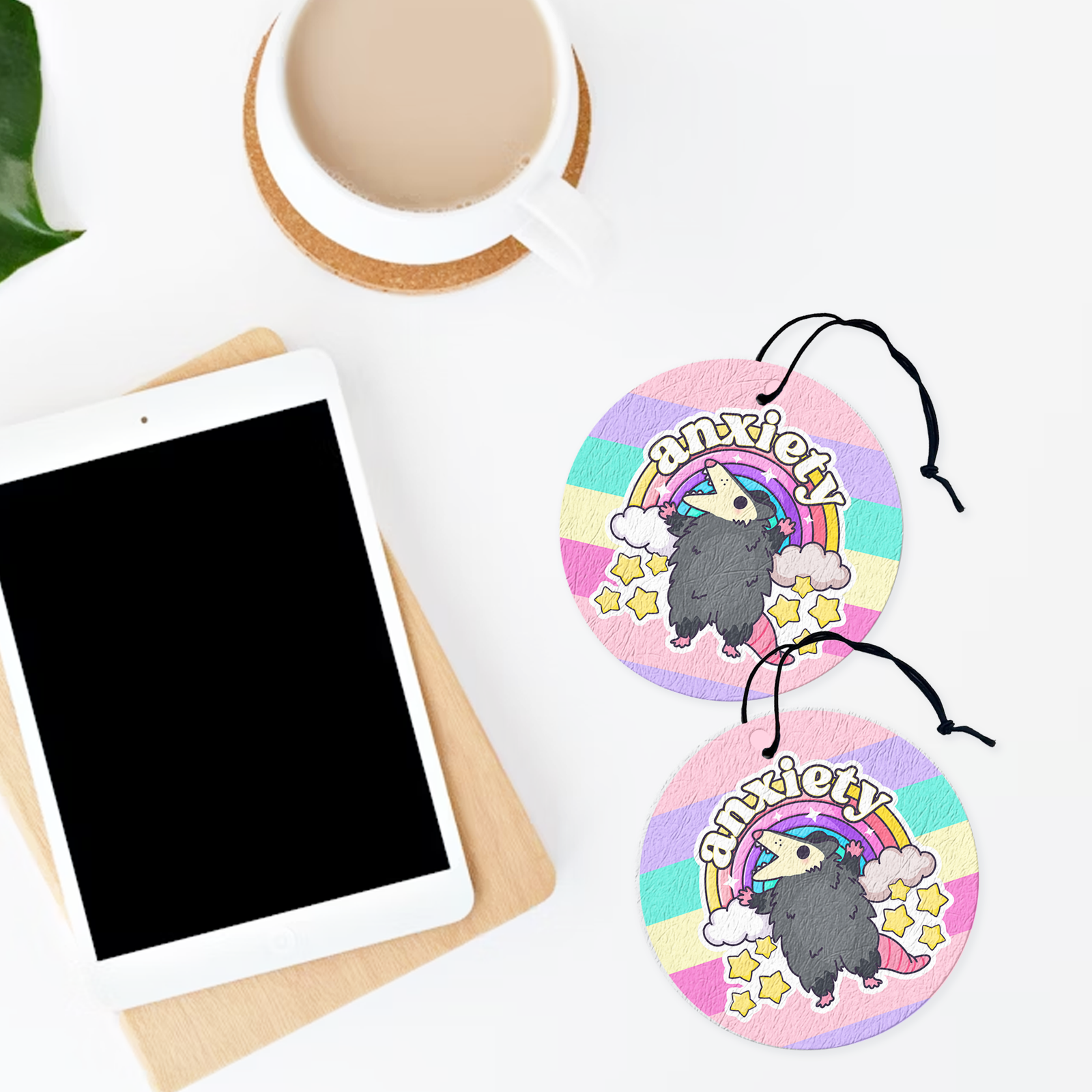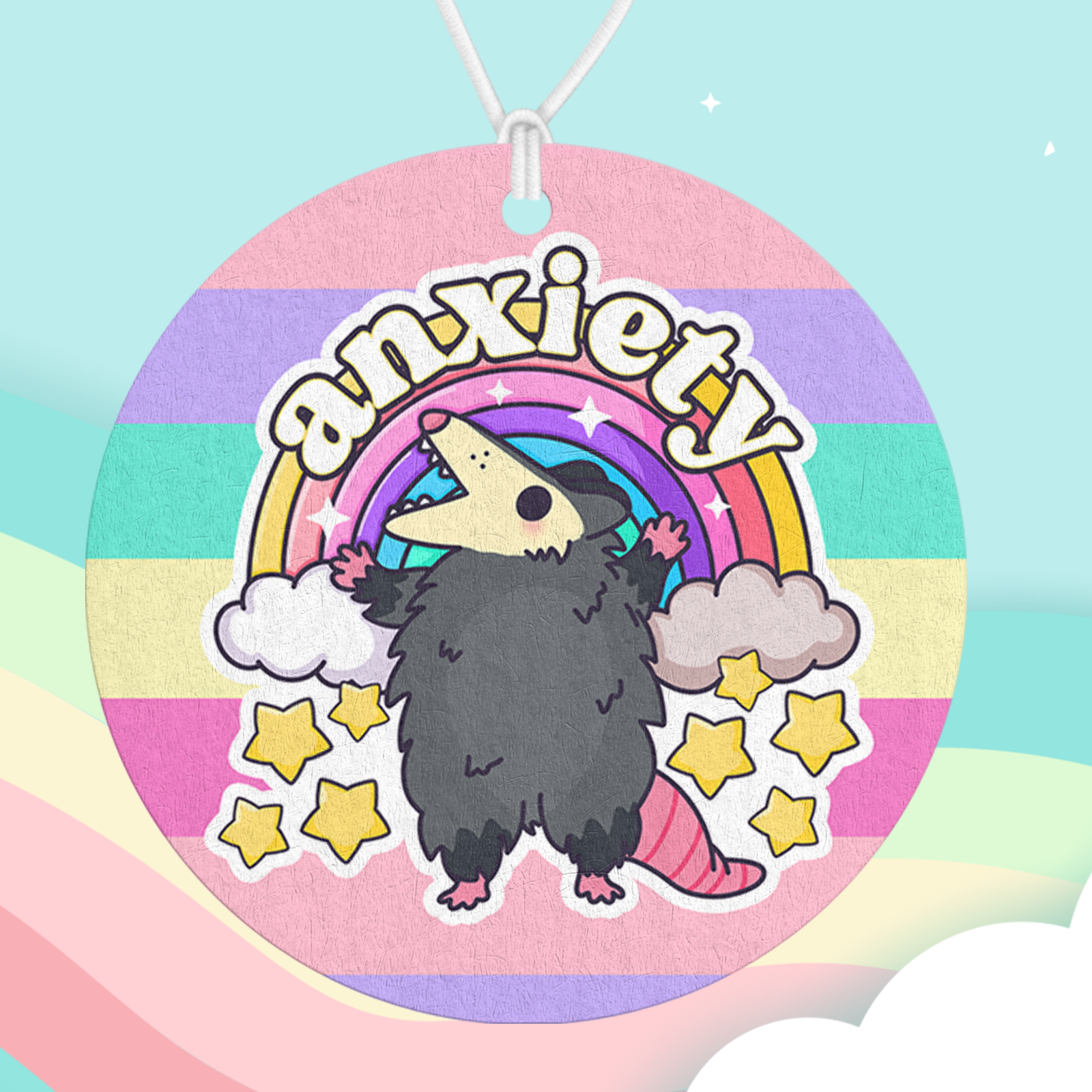 A bright and expressive air freshener featuring our Anxiety Rainbow Possum design. Add your favorite scent and bring a little color, comfort, and personality to your space.