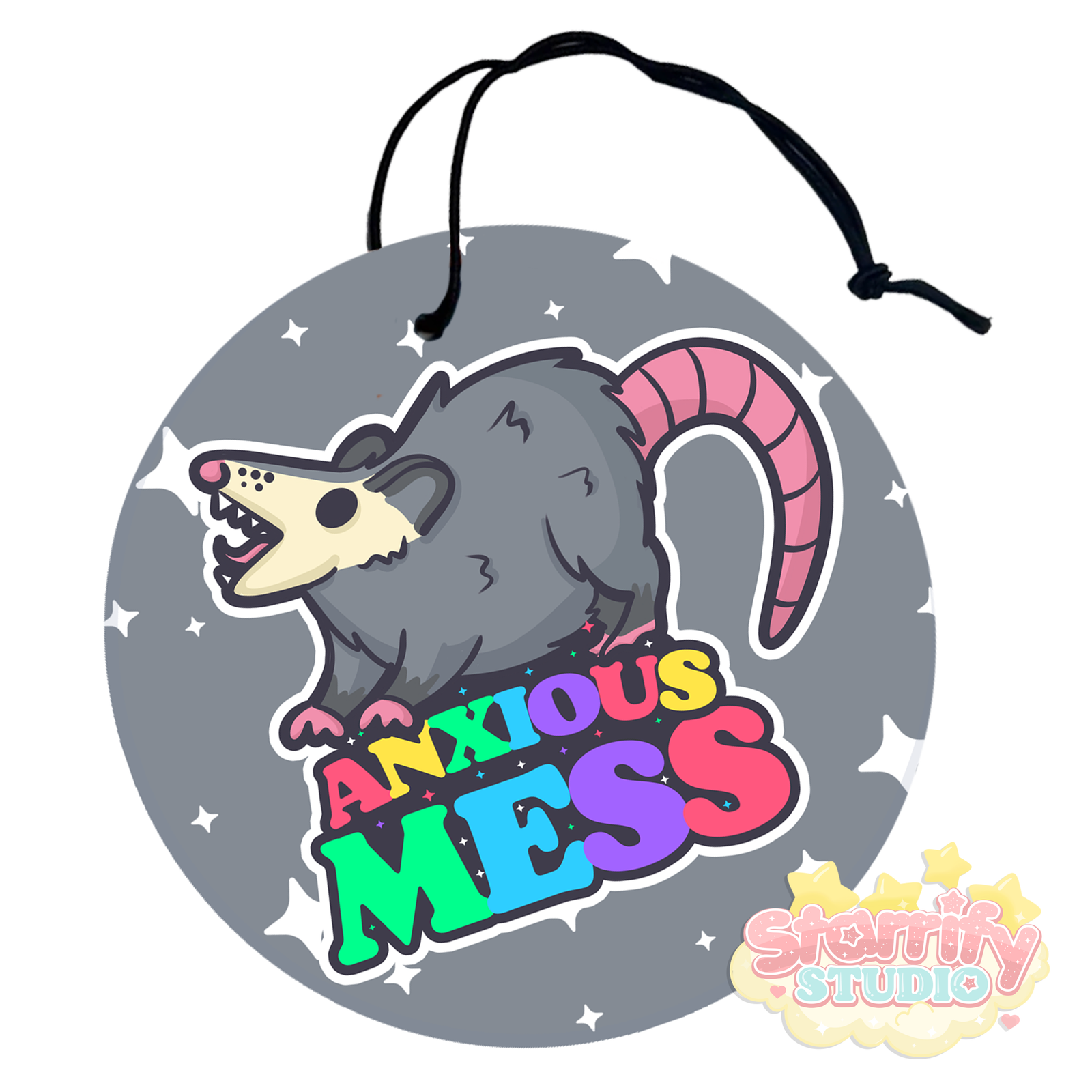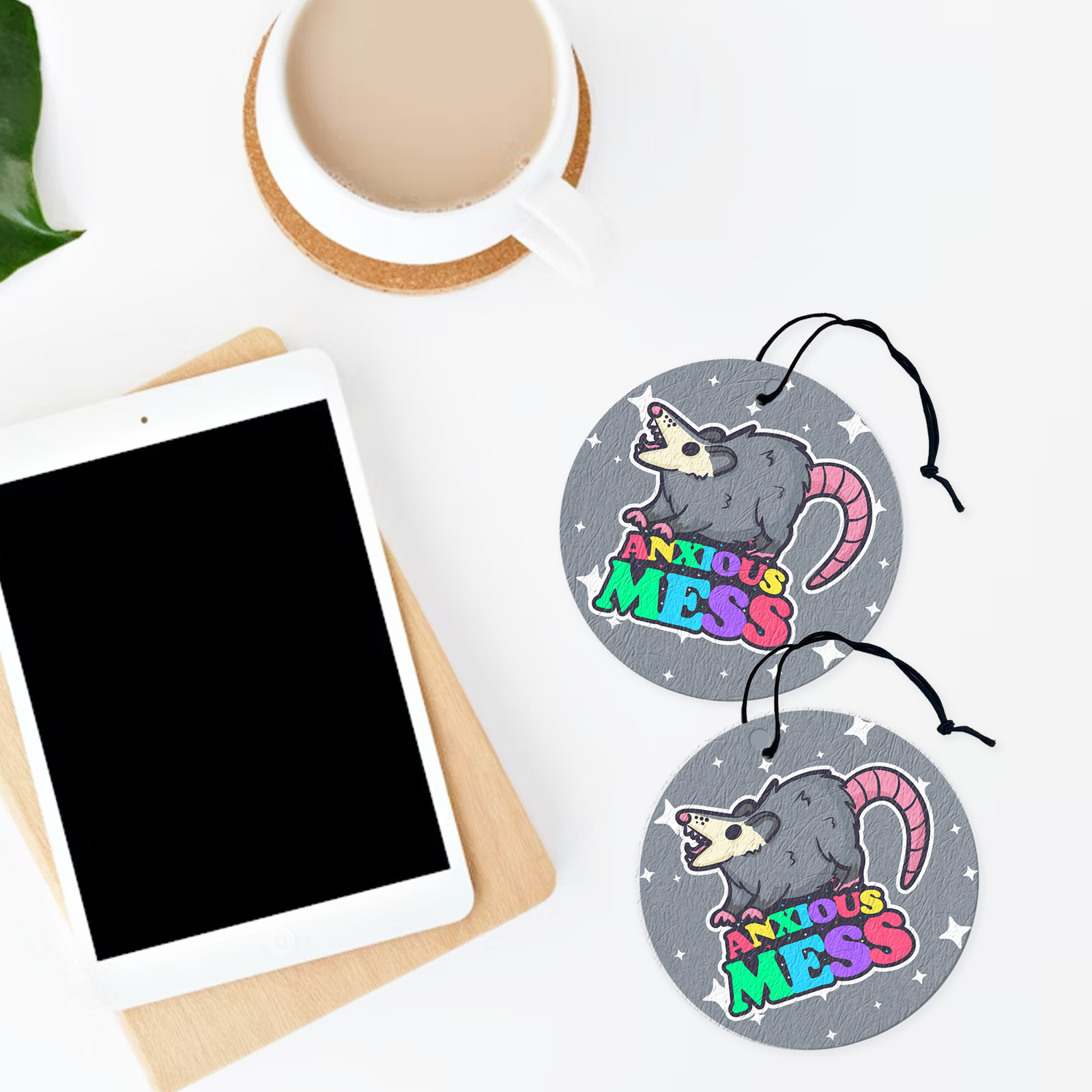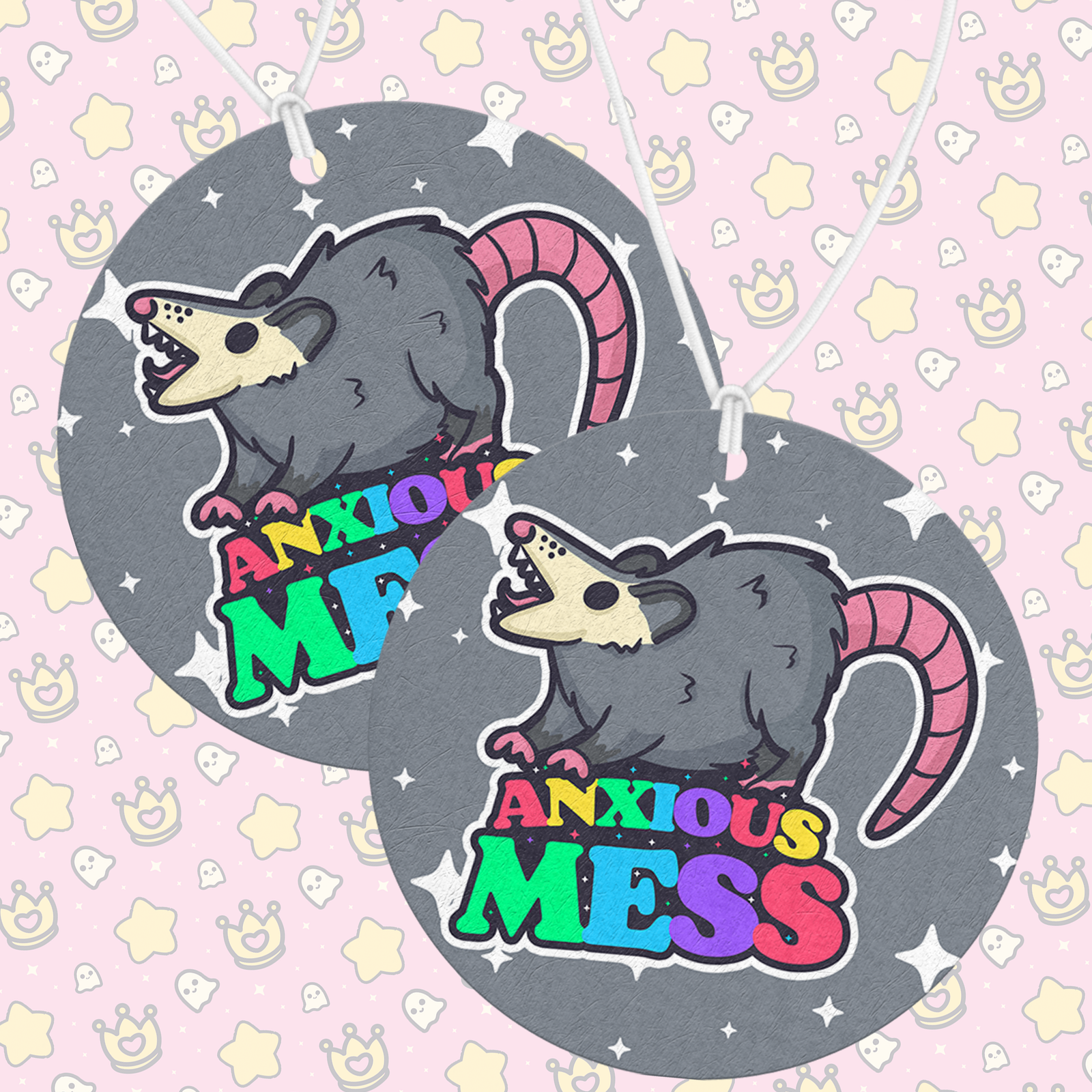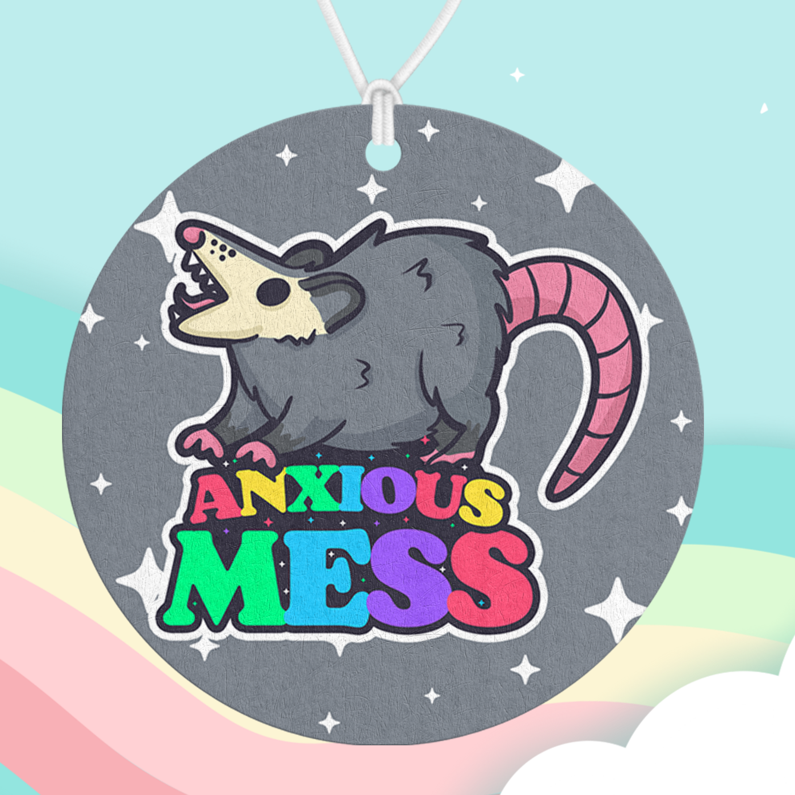 A chaotic and relatable air freshener featuring our Anxious Mess Possum design. Add your favorite scent and bring a little humor and honesty to your space.