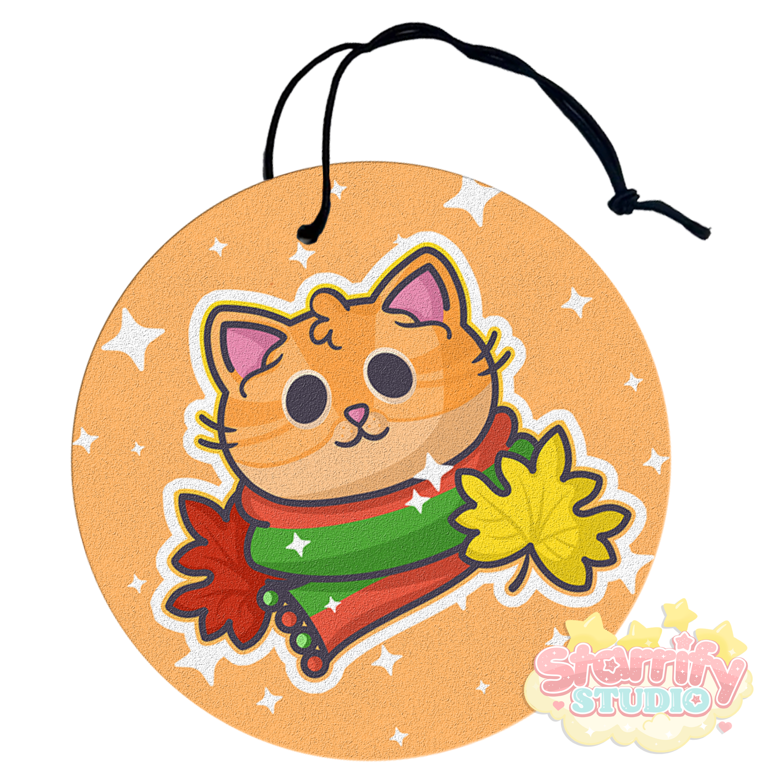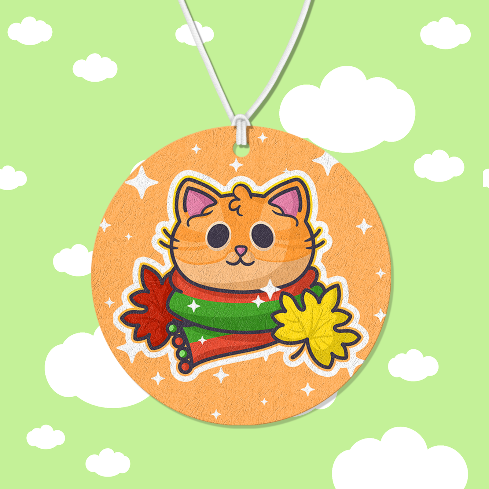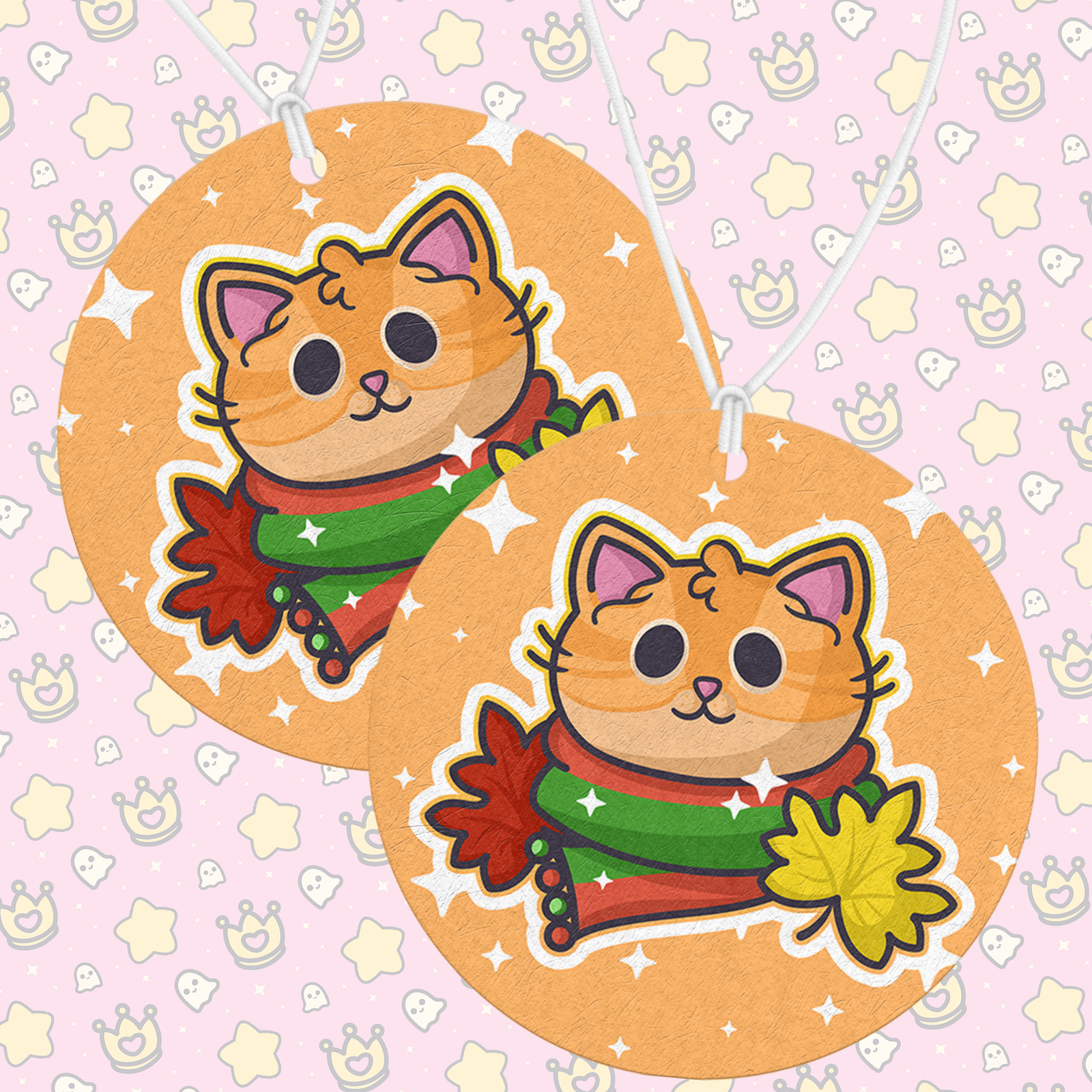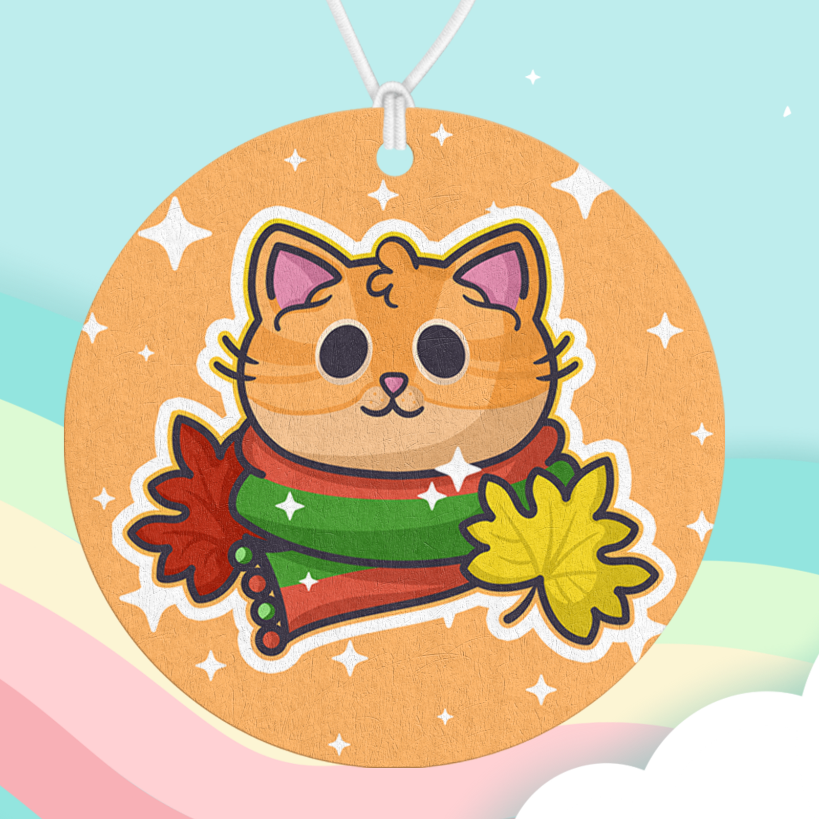 A cozy and seasonal air freshener featuring our Autumn Ginger Kitty design. Add your favorite scent and bring a little warmth and autumn charm to your space.
