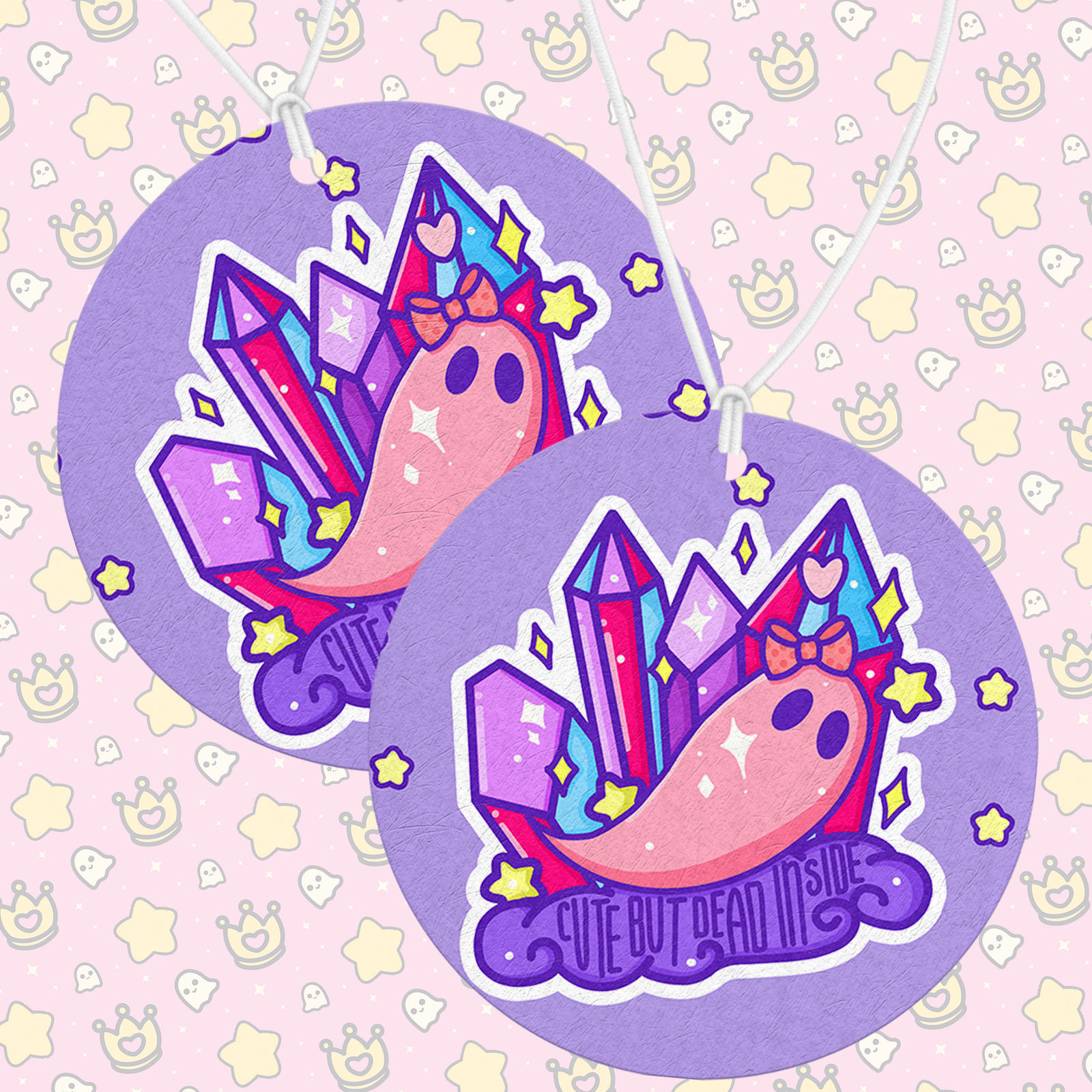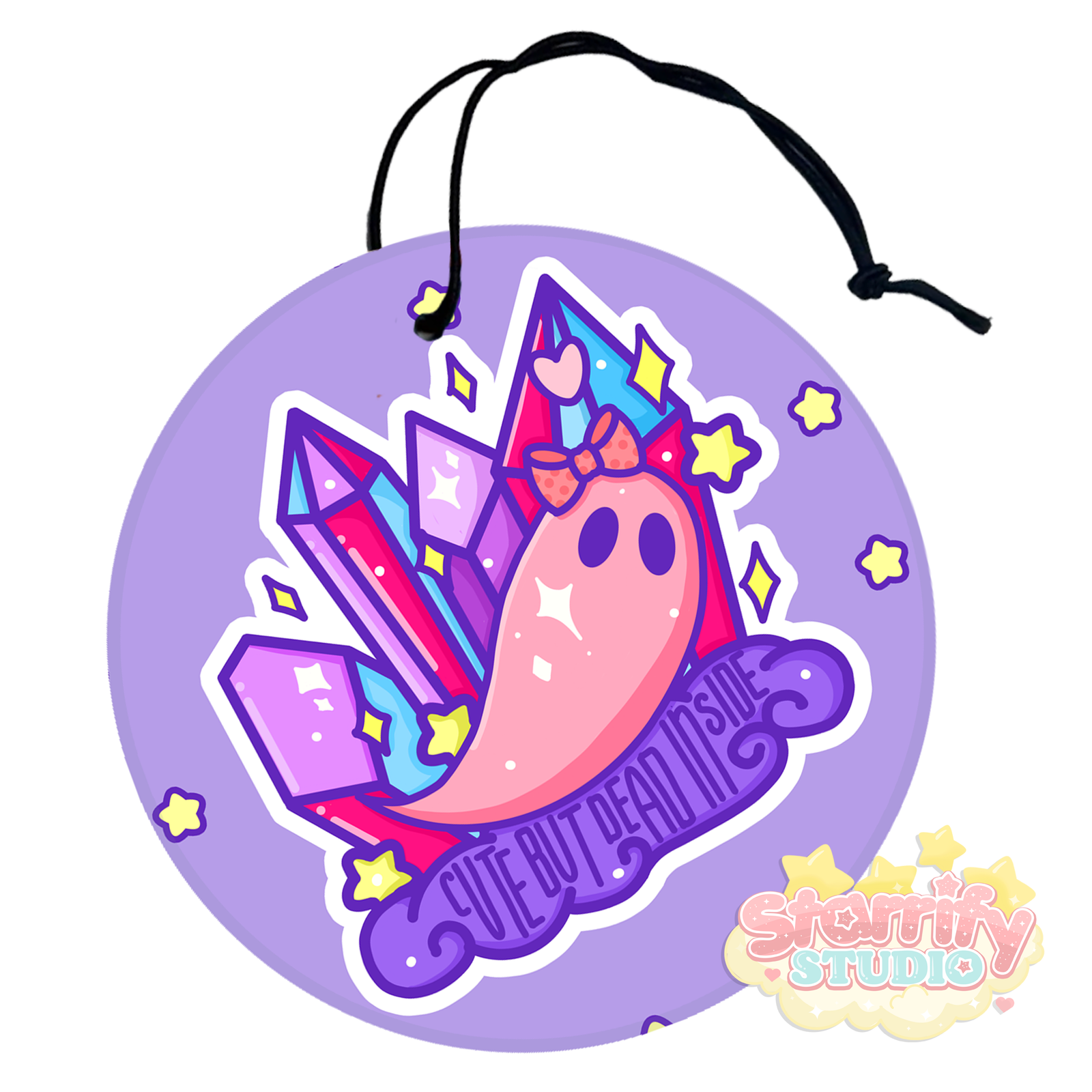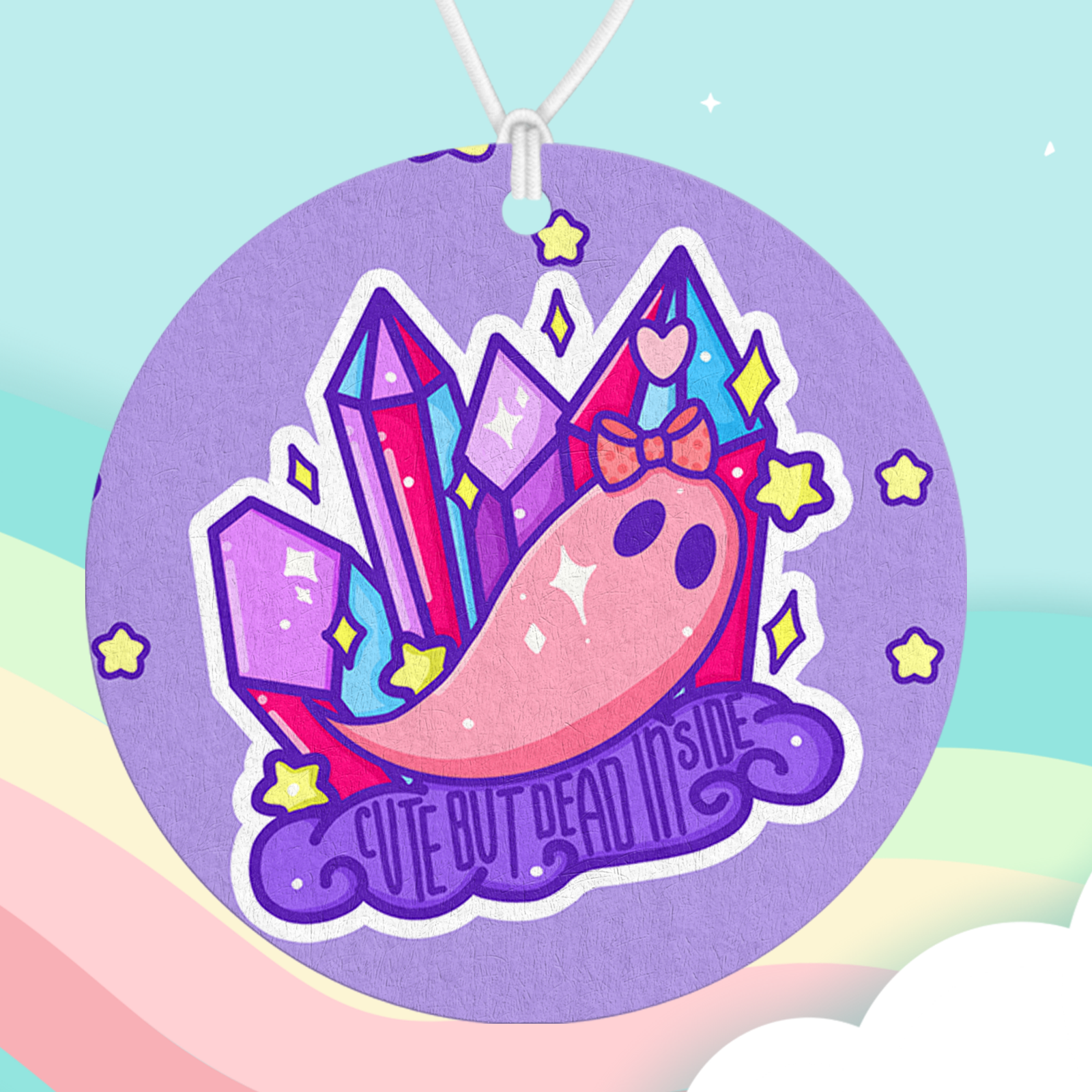 A cute and slightly spooky air freshener featuring our Cute But Dead Inside design. Add your favorite scent and bring a little dark humor and playful charm to your space.