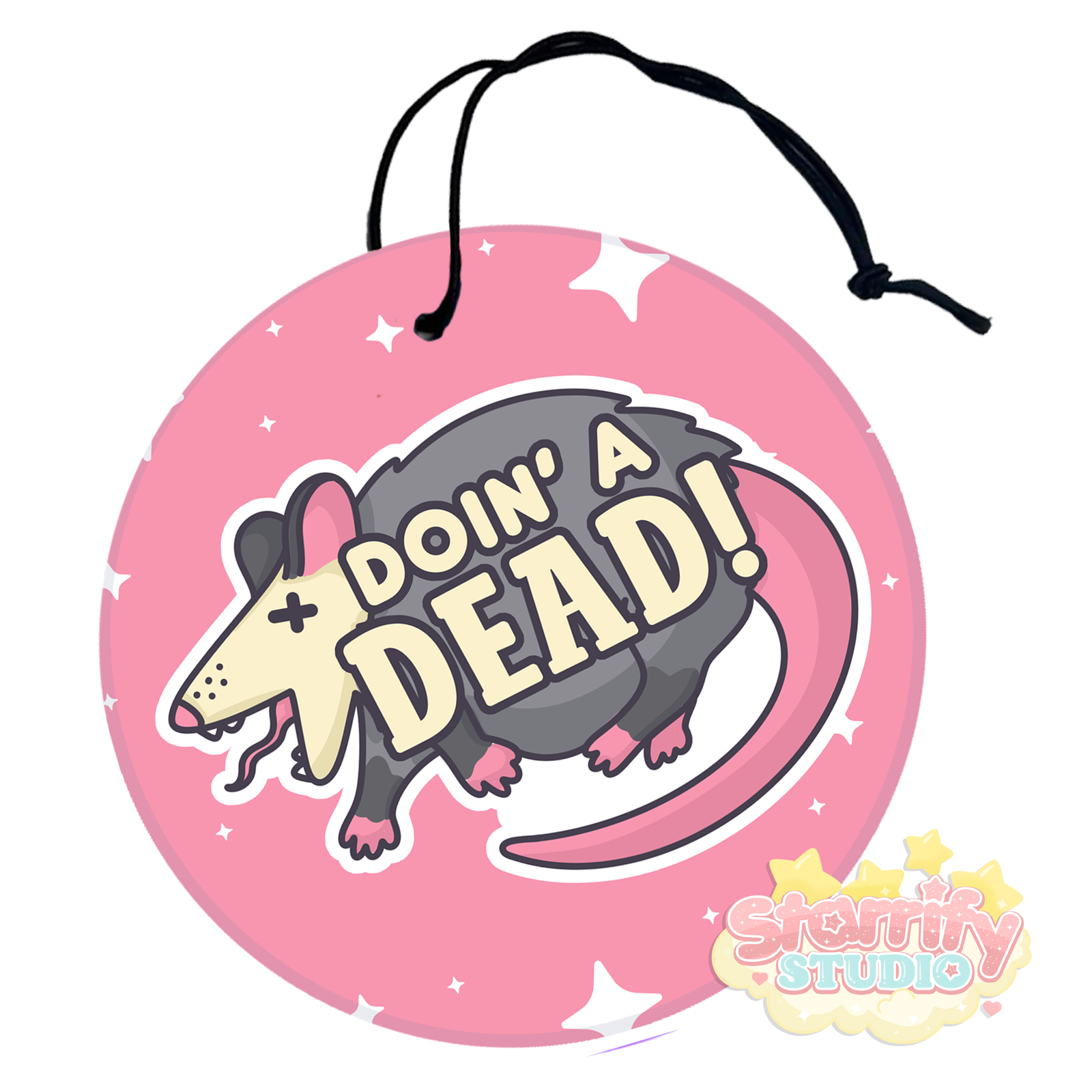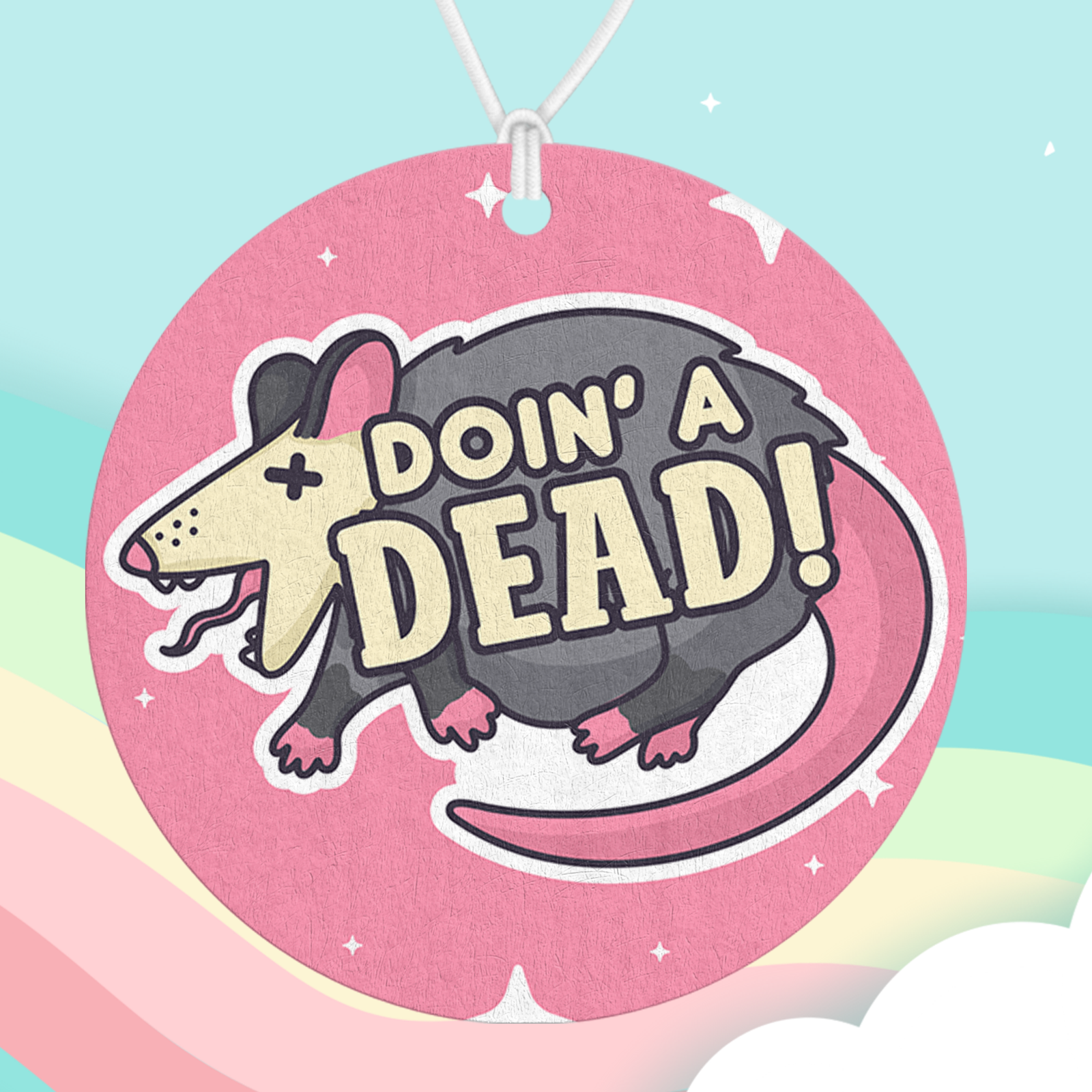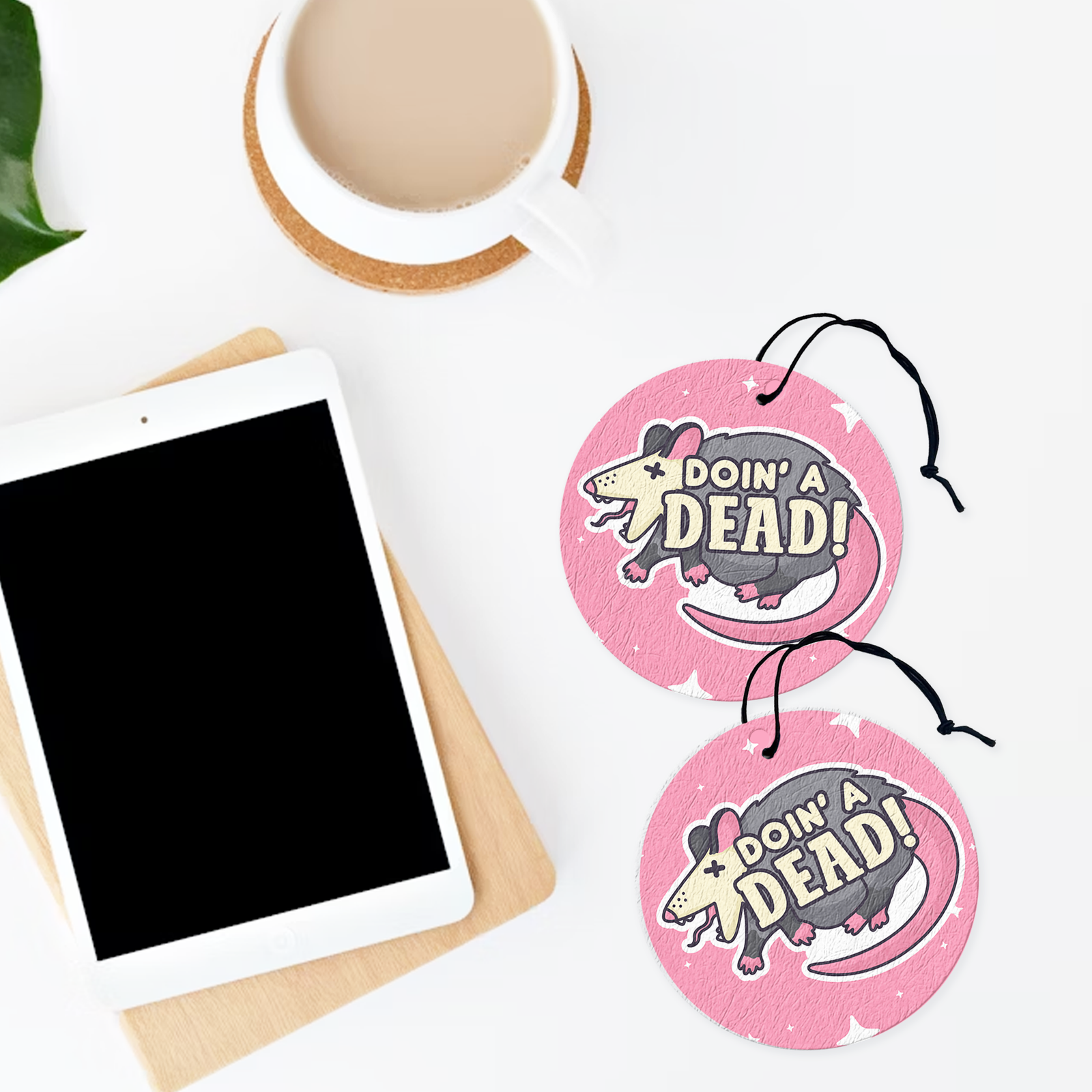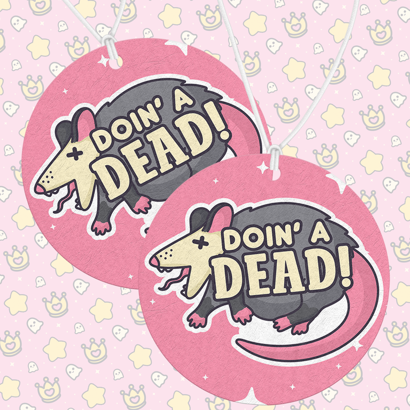A darkly cute air freshener featuring our “Doin’ A Dead” possum design. Add your favorite scent and bring a little anxious humor and chaotic comfort to your space.