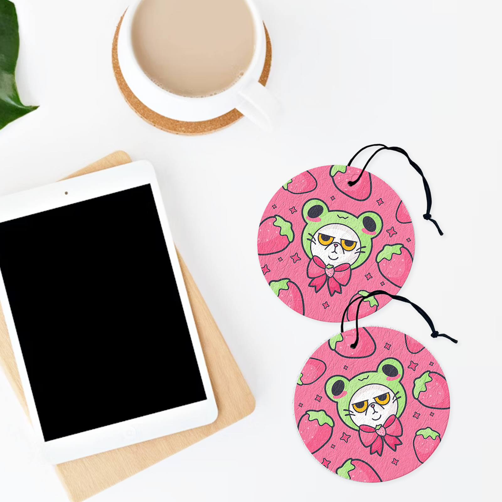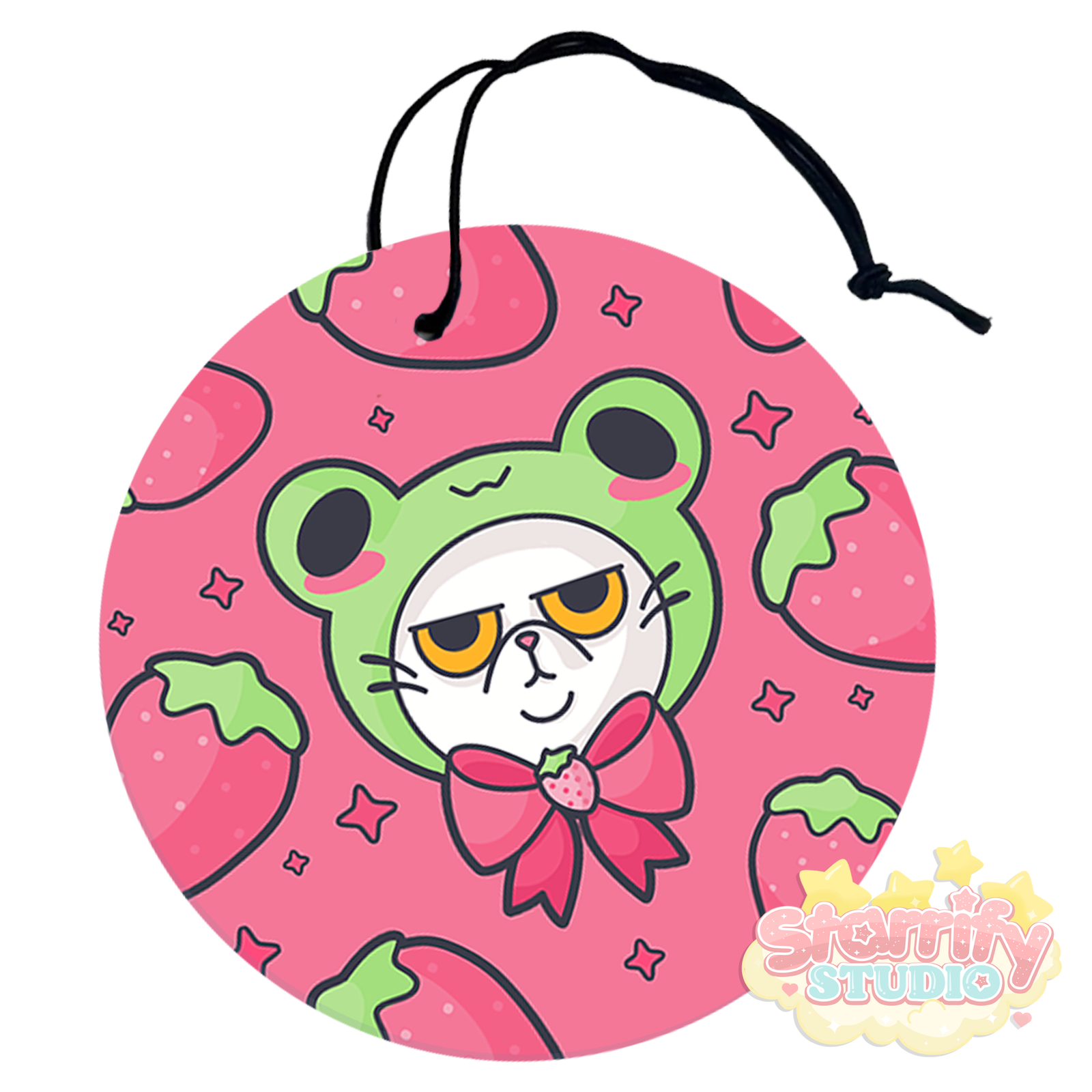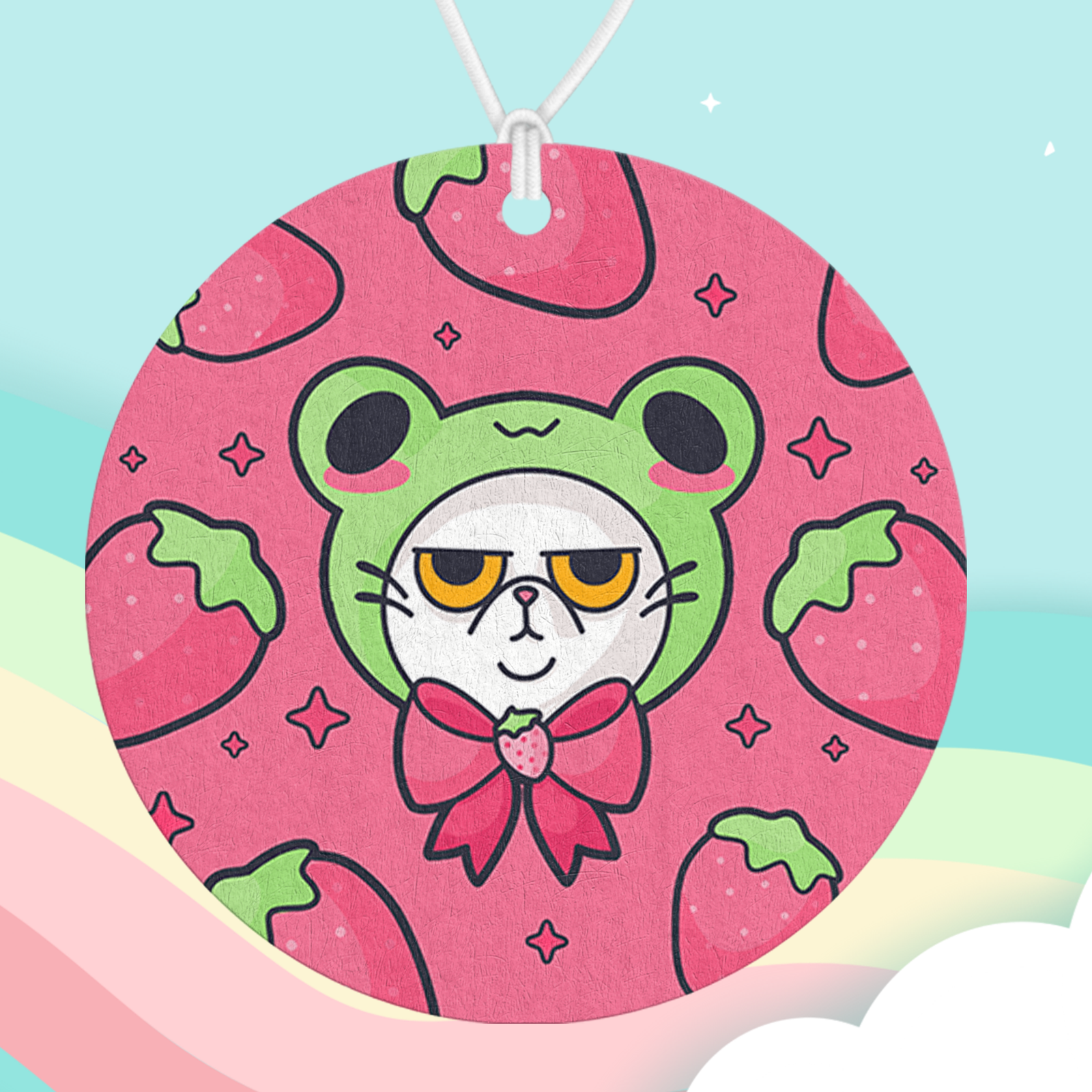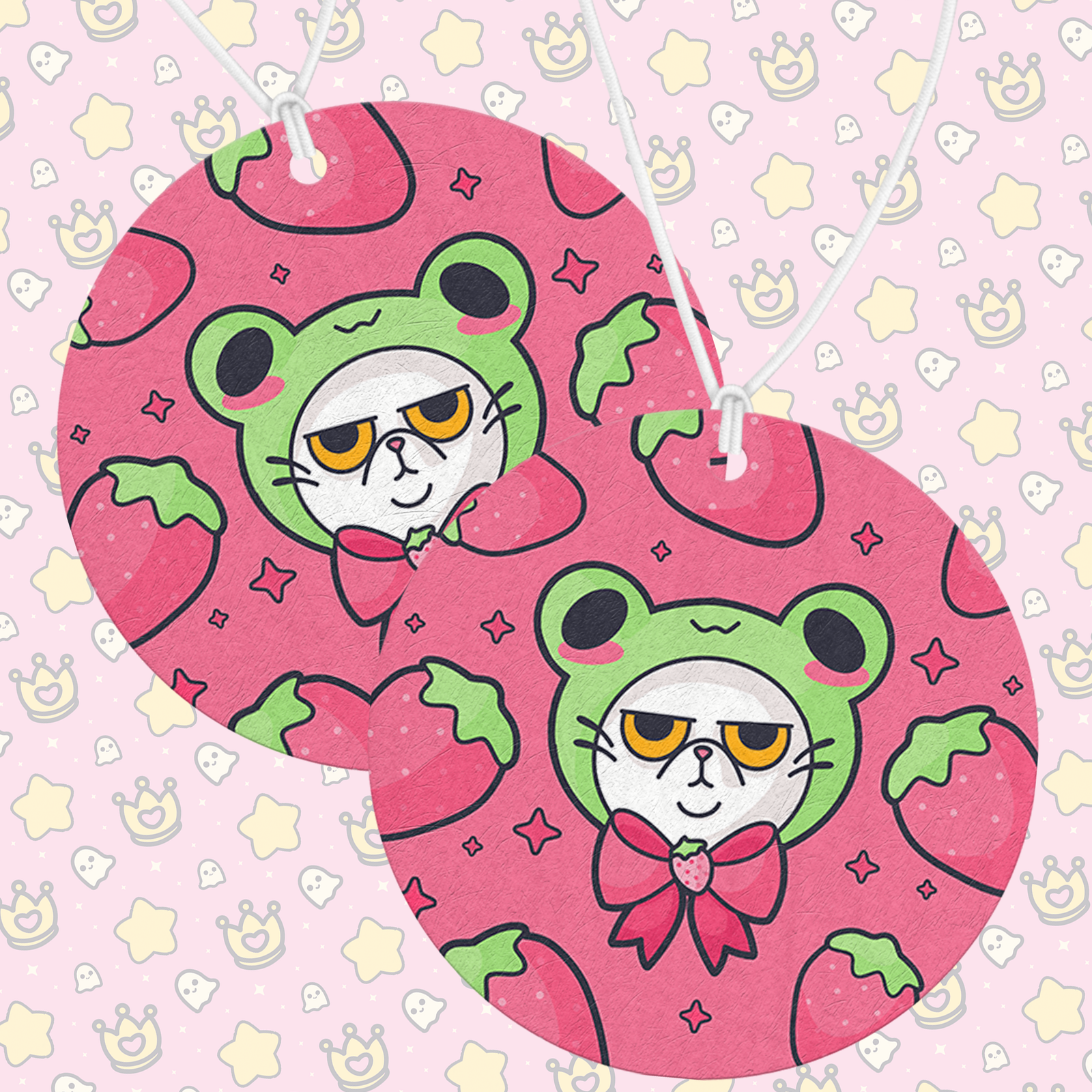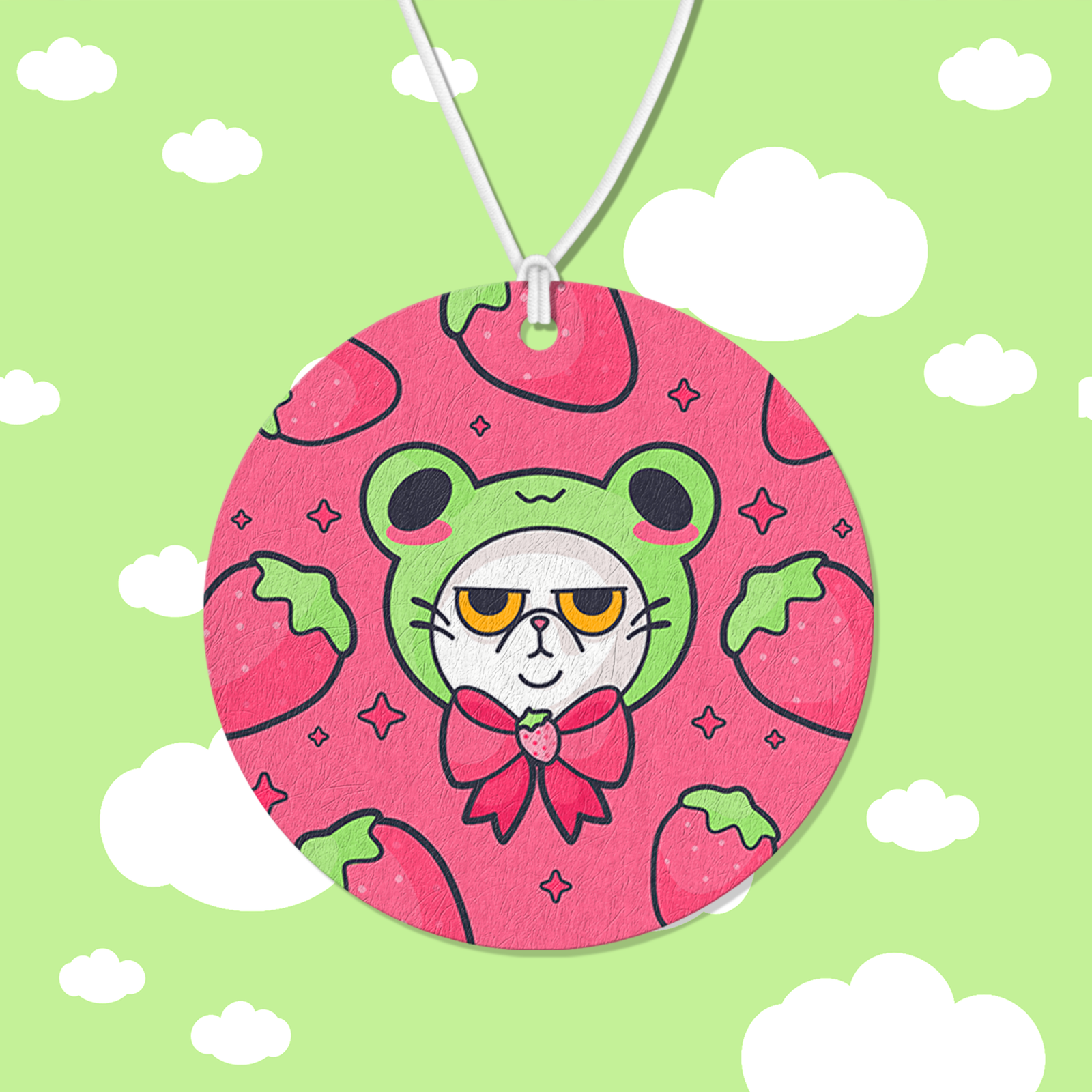 A grumpy little strawberry cat air freshener with serious attitude and sweet vibes. Add your favorite scent and bring a perfectly unimpressed mood to your space.